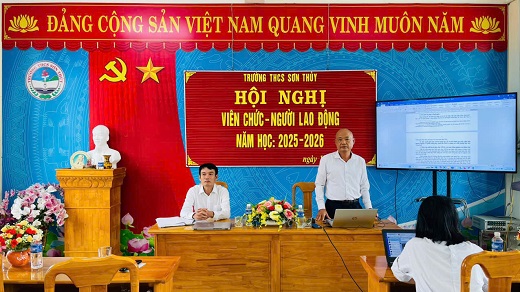 Chiều 19/9/ 2025, Trường THCS Sơn Thủy tổ chức Hội nghị viên chức, người lao động năm học 2025 – 2026. Đây là hoạt động thường niên vào đầu năm học, để tập thể sư phạm nhà trường nhìn lại những thành tích đã đạt được trong năm học qua, đồng thời trao đổi và thống nhất phương hướng, nhiệm vụ, cùng các giải pháp thực hiện thắng lợi kế hoạch năm học mới.