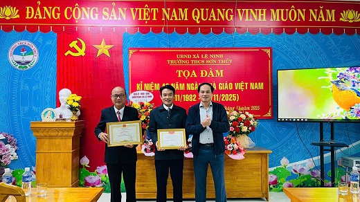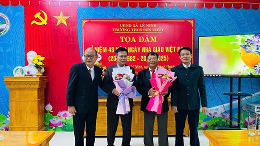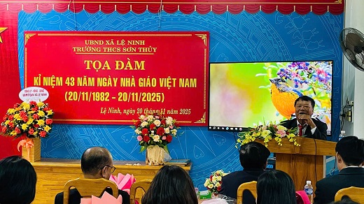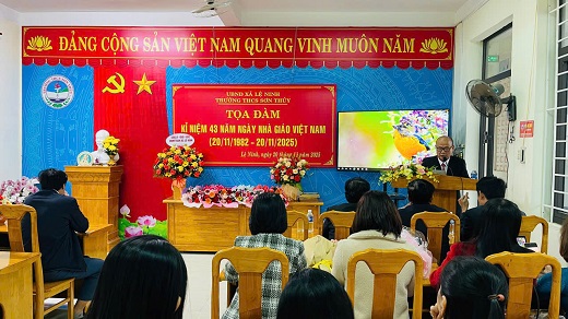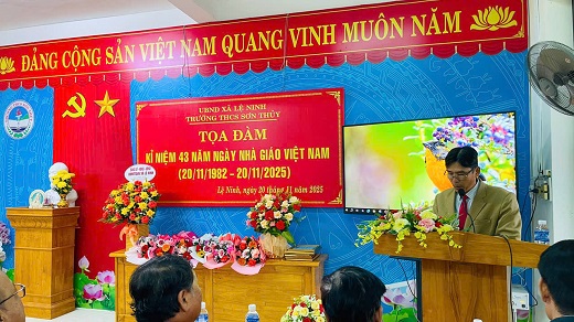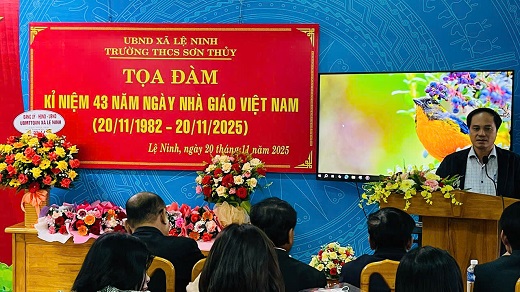 Ngày 20/11/ 2025 Trường THCS Sơn Thủy tổ chức Tọa đàm kỷ niệm 43 năm ngày nhà giáo Việt Nam (20/11/1982-20/11/2025), dự tọa đàm có đồng chí Nguyễn Hữu Hán, Phó Bí thư Đảng ủy, Chủ tịch UBND xã Lệ Ninh; Các Anh, Chị Thường trực Hội Cha mẹ học sinh; Các nhà giáo lão thành nguyên là Cán bộ Quản lý của nhà trường qua các thời kỳ; Cùng toàn thể CBGVNV Trường THCS Sơn Thủy.